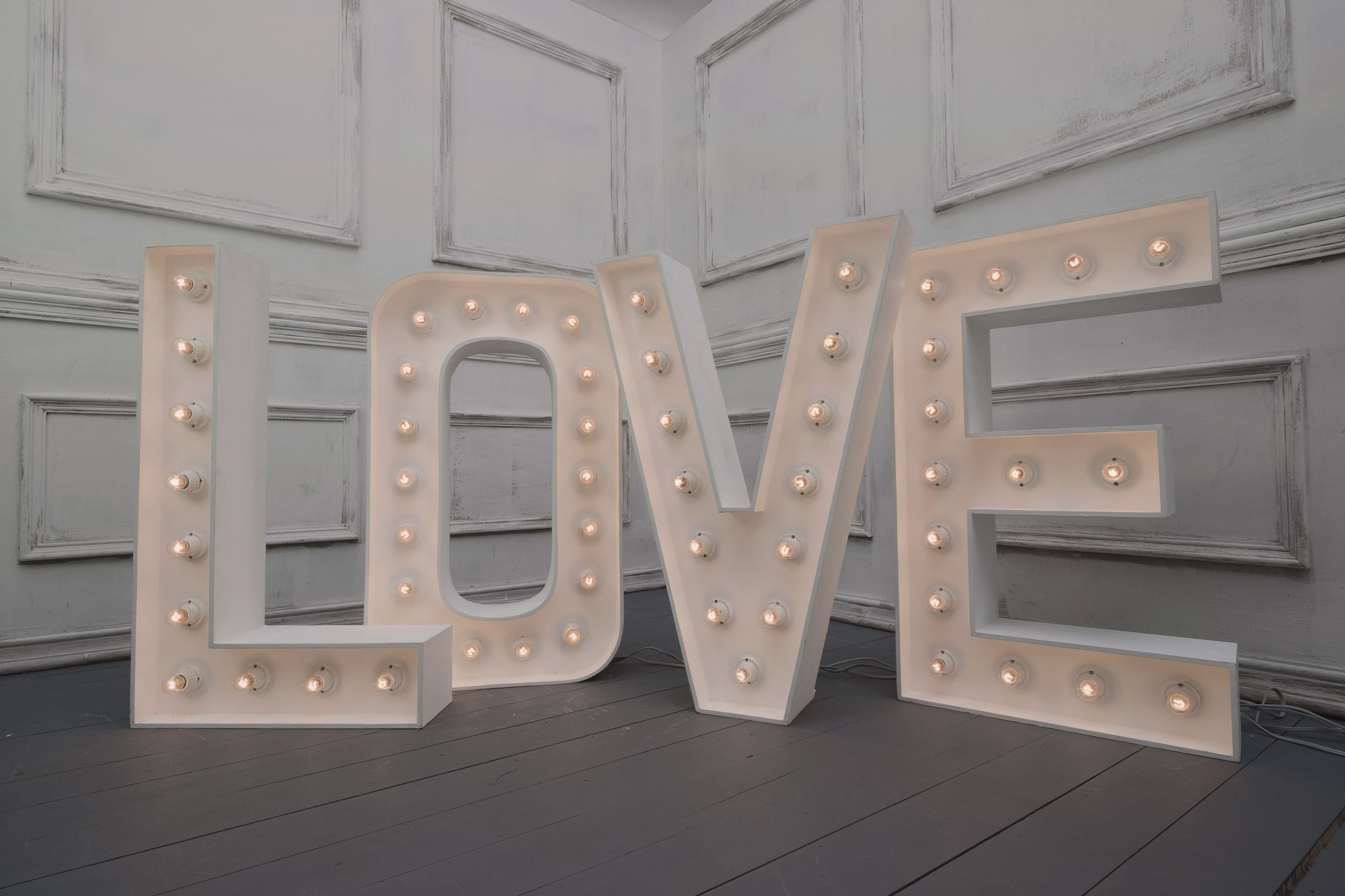 Our letters are 4ft high by 2ft wide, some of our letters are a little wider such as M, W and & sign. Our letters are fairly heavy, however we will deliver, set up and then collect the following morning from your venue. Each letter is connected with 3m power cable, we also supply an extension lead if required.